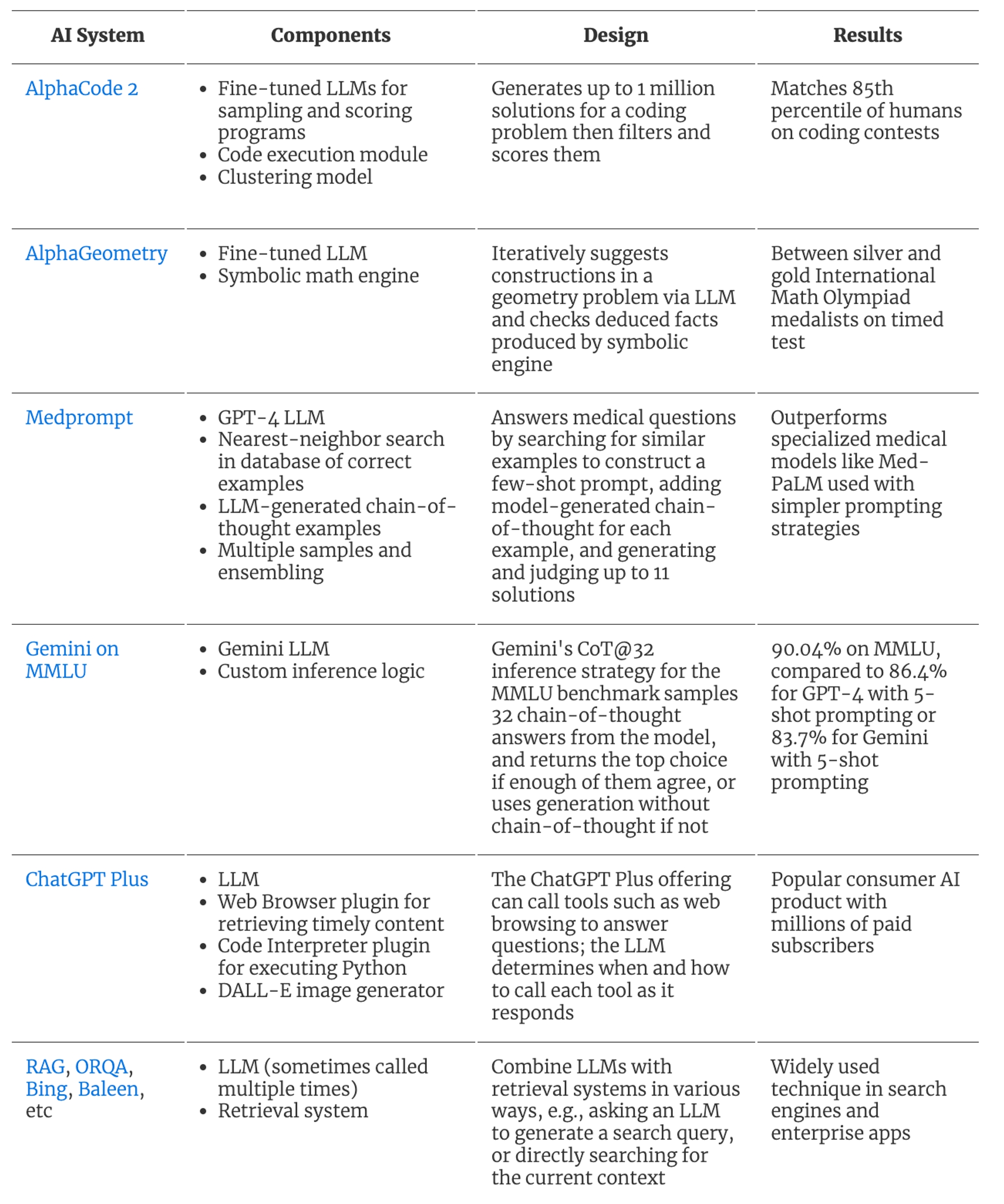 다음은 디자인 선택의 폭을 보여주는 몇 가지 최근 복합 AI 시스템입니다.